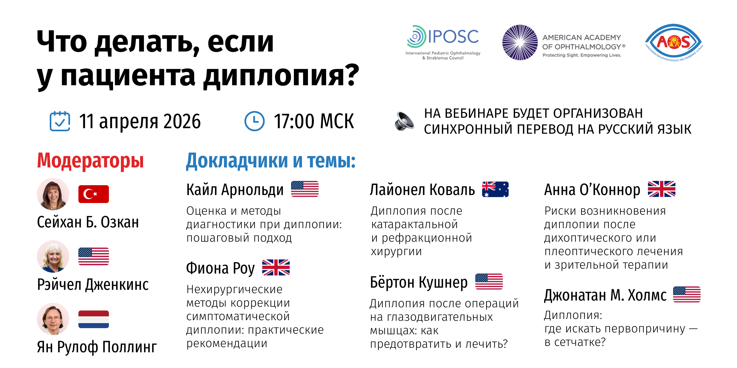 Этот вебинар организован совместно Международным советом по детской офтальмологии и страбизмологии (International Pediatric Ophthalmology and Strabismus Council, IPOSC) и Американской академией офтальмологии (American Academy of Ophthalmology, AAO).